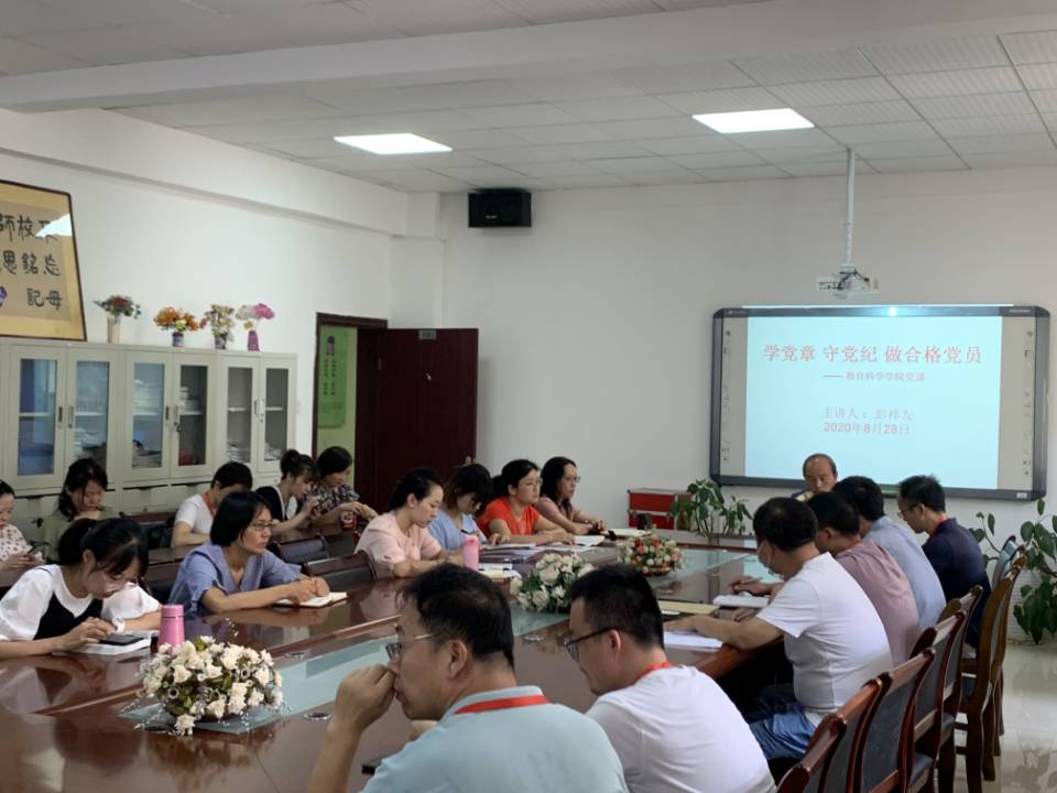 8月28日下午,教育科学学院全体教师党员在逸夫楼321会议室举行“党课开讲啦”活动,学院党委书记彭祥友以“学党章,守党纪,做合格党员”为主题给全体教师党员上党课。