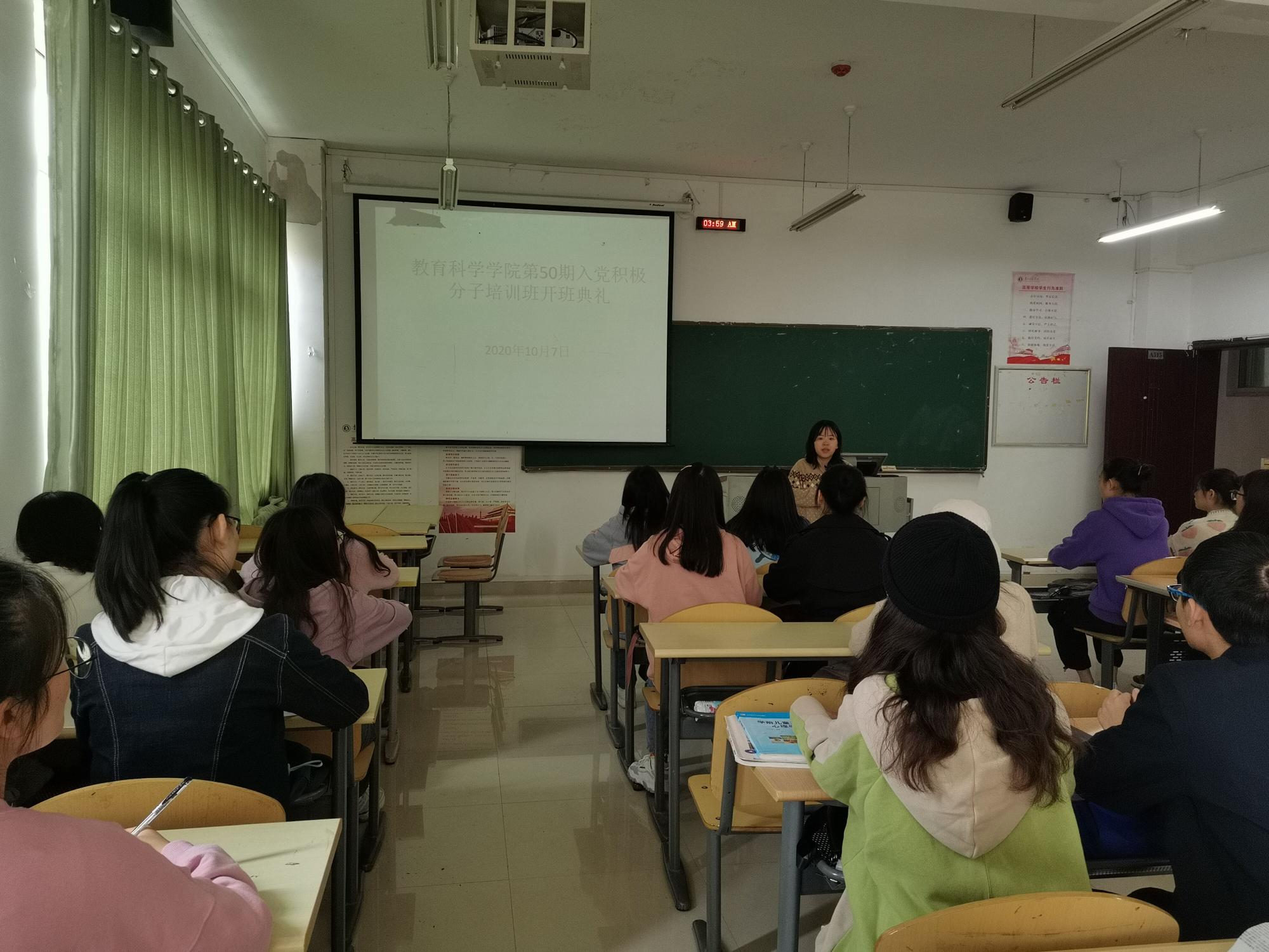 10月7日中午,教育科学学院第50期入党积极分子培训班在逸夫楼515教室举行开班典礼,学院党委书记彭祥友、学生党支部书记申苒出席开班典礼,第50期全体学员到场参加。会议由申苒主持。