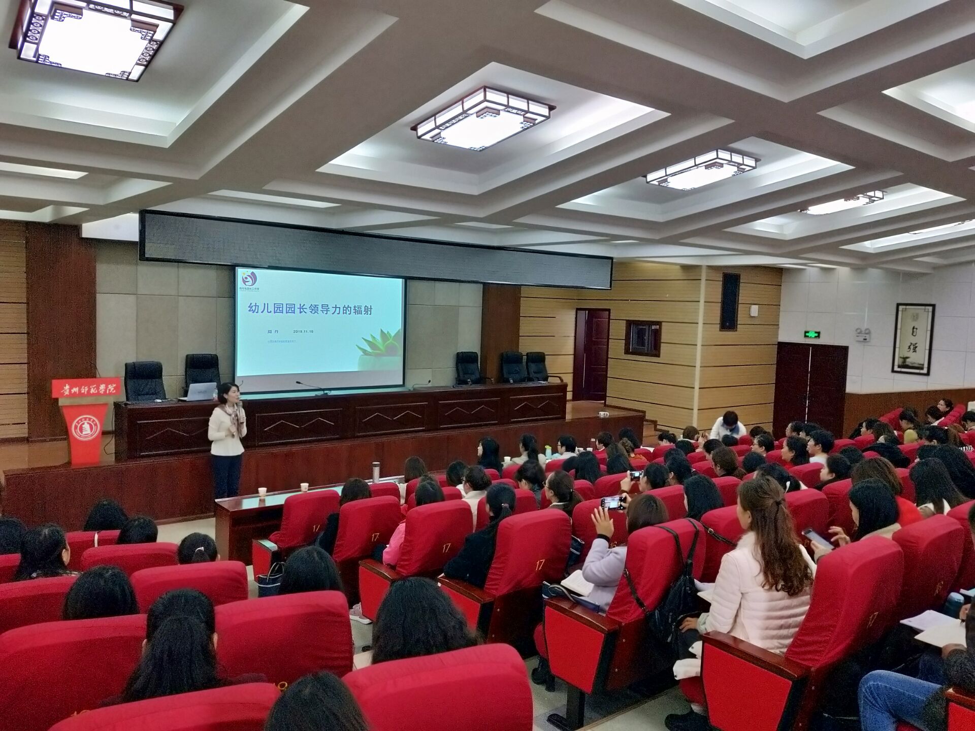 2019年11月17日,广东省新一轮名园长工作室主持人、广东省学前教育专业委员会讲师、广东省学前教育督导评估专家、东莞市优秀园长周丹莅临我校,在道德讲堂做《园长领导力的辐射:以园长工作室建设为例》专题讲座。讲座由教育科学学院郑玉莲博士主持,我校“国培计划(2019)”——幼师国培乡村幼儿园骨干园长能力素质提升项目的全体学员聆听此次讲座。