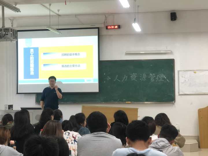 参赛教师杨宇鑫在“人力资源管理”的课程中,以“招聘和面试”为主要的教学内容,通过案例引入,以问题为导向,积极引导学生思考,注重学生对问题解决能力的培养。课后,李建年老师、郑玉莲博士、刘婧老师、罗凯老师、黄蓉老师围绕课程实施的目标、教学方法、教学组织方面开展研讨,特别针对参加此次教学比赛活动进行探索和经验分享。