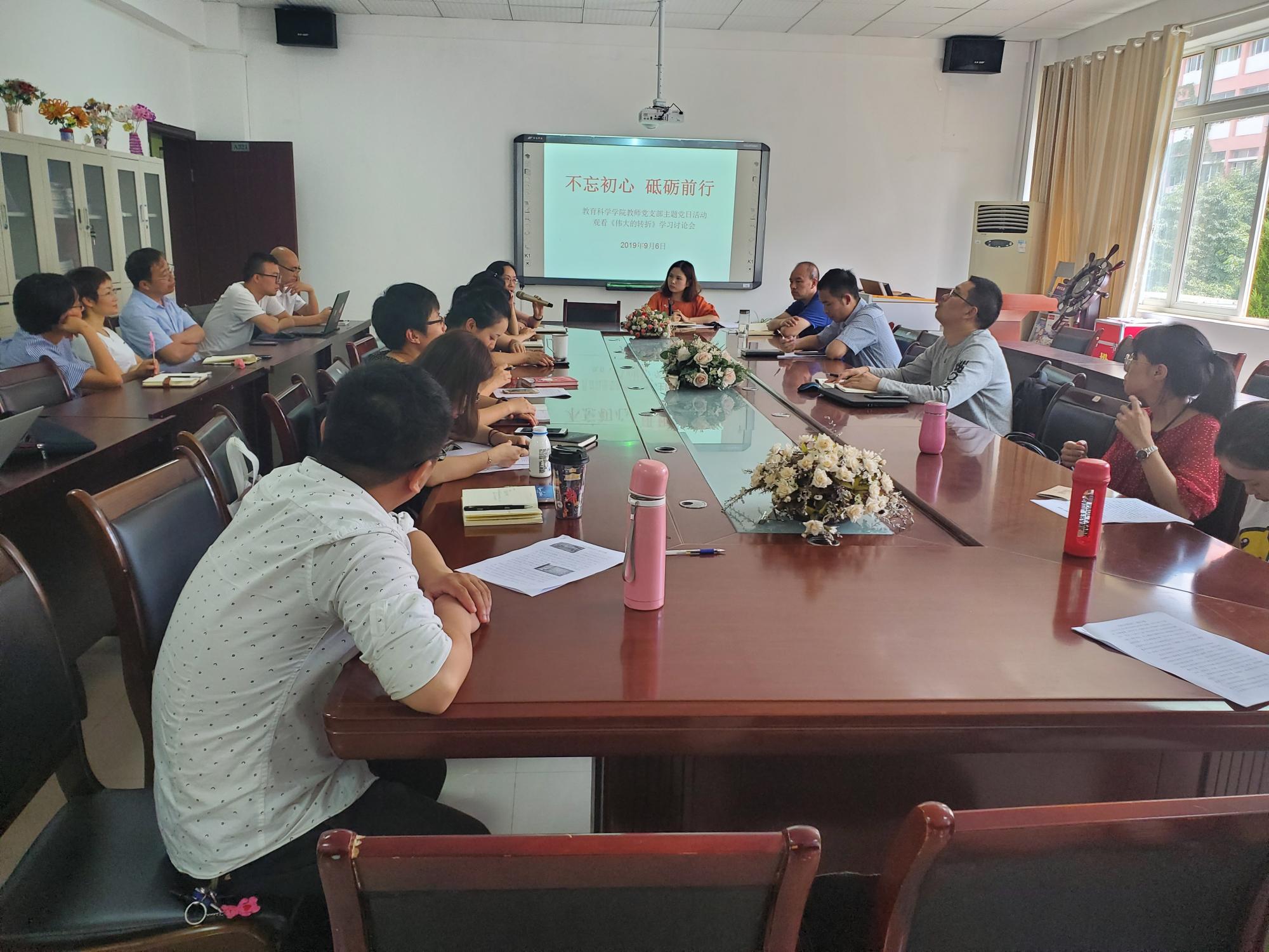 为发扬和传承红色革命传统精神,深入推进“不忘初心,砥砺前行”的教育主题活动,2019年9月6日教育科学学院教师党支部召开了观看《伟大的转折》学习讨论会,教科院全体党员教师参与了交流讨论,并发表了对《伟大的转折》这部电视剧的观后感。