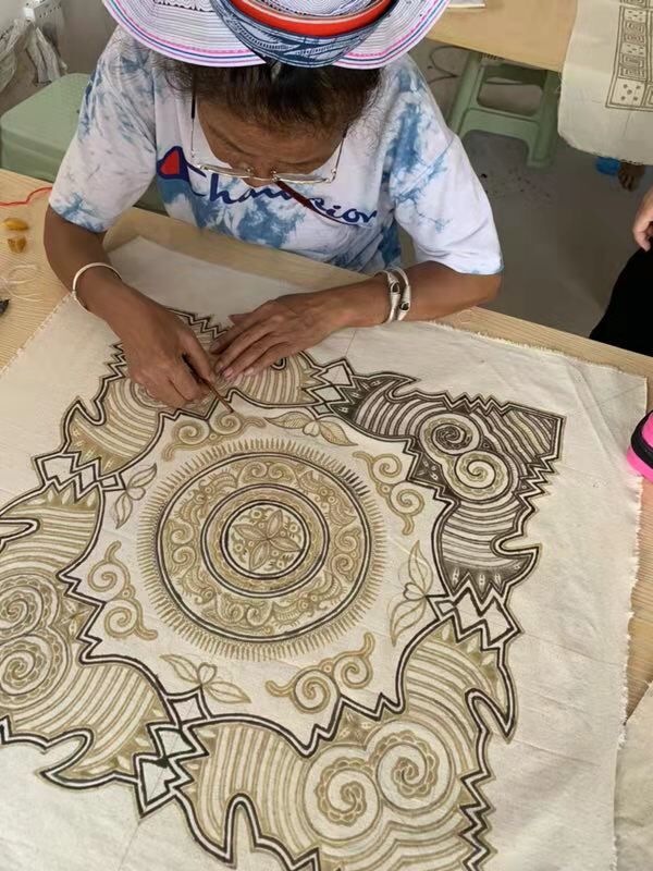 7月30日下午,调研一行来到具黄平重安镇革家蜡染厂,了解黄平蜡染的悠久历史和制作过程。革家蜡染历史悠久,以图案匀称、疏密相间、花纹别致、风格独特而著称于世。用特制的蜡刀蘸上加温煮化的蜡块,在棉布上描绘出蝴蝶、花、鸟、虫、鱼等各种图案,放入靛蓝染液中浸染,再加温煮化蜡纹,留下图案。团队老师表示,希望能将蜡染制作过程走进幼儿园,应用到幼儿园课程中