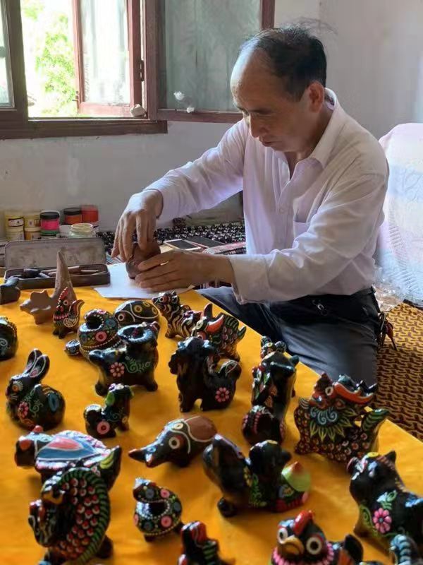 2015年7月29日-30日,调研团队一行冒着酷暑,经西江苗寨,辗转来到飞云洞国家级级非物质文化遗产黄平泥哨厂探访非遗传承人陈应魁老人,探寻古老的泥哨制作过程。陈应魁老人是黄平泥哨的传承人,他制作的泥哨形态夸张、色彩鲜艳、栩栩如生,风格独特,极具地方民族特色。经吴老先生亲自制作与讲述,了解到泥哨用当地优质黄泥做基本原料,通过纯手工搓捏成型,木屑松枝锻烧、上色涂油等多道工序制作而成,每个泥哨底部有一个吹气孔和一个回气孔,能吹出清脆悦耳的声音。调研团队中的每位老师亲自将黄泥置于手中感受捏泥哨的乐趣,并一起探讨如何将泥哨制作融入到幼儿园课程之中,让幼儿能感受到制作泥哨的乐趣,将民族文化发扬和传承下去。