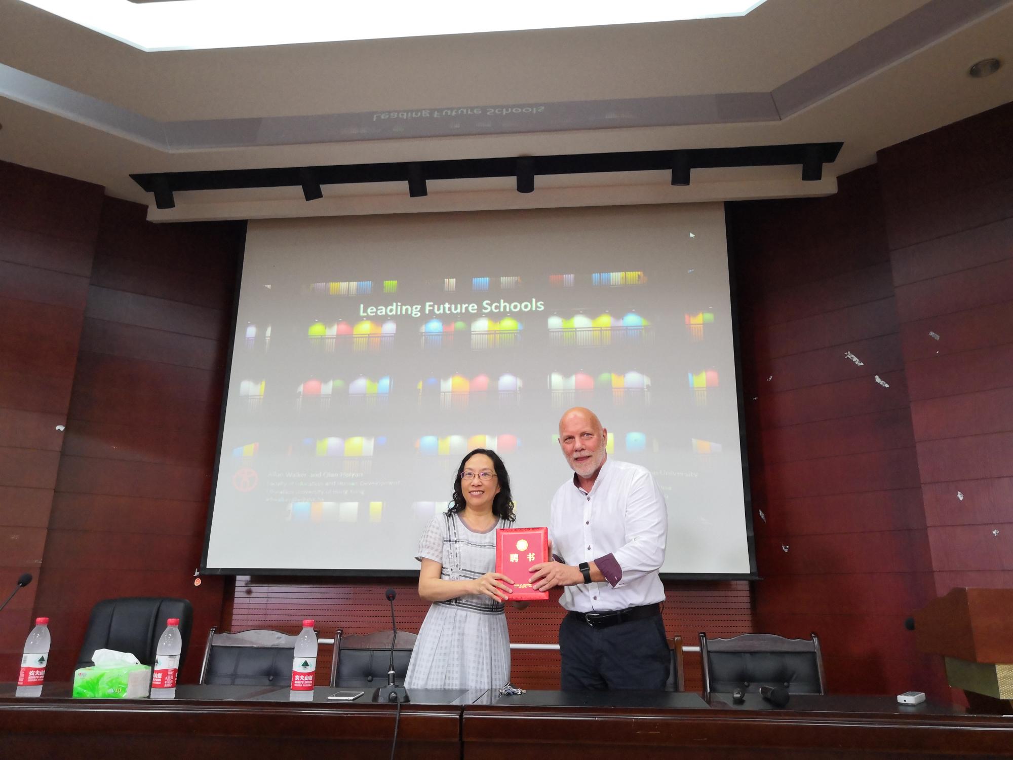 首先,教育科学院学院刘红院长向Alan Walker教授颁发了客座教授的聘书,Alan Walker教授受邀成为教育科学学院特聘课程教授。接着,Alan Walker教授面向教育科学学院全体学生干部及部分教师代表开讲。Alan Walker教授让同学们以想象自己是一个领导,自己最有激情去做的的事情是什么?你最尊敬的领导是谁,你希望自己在别人眼中是一个什么样的领导等三个问题,将学生干部们带入角色进行思考,并与现场学生干部进行现场互动和交流。接着Alan Walker教授为大家描述了未来学校发展的前景,并带领同学们一起学习和思考了领导未来学校的7个原则,包括面向未来的领导,基于证据和产出、能够做事、能够打开新的视野等。