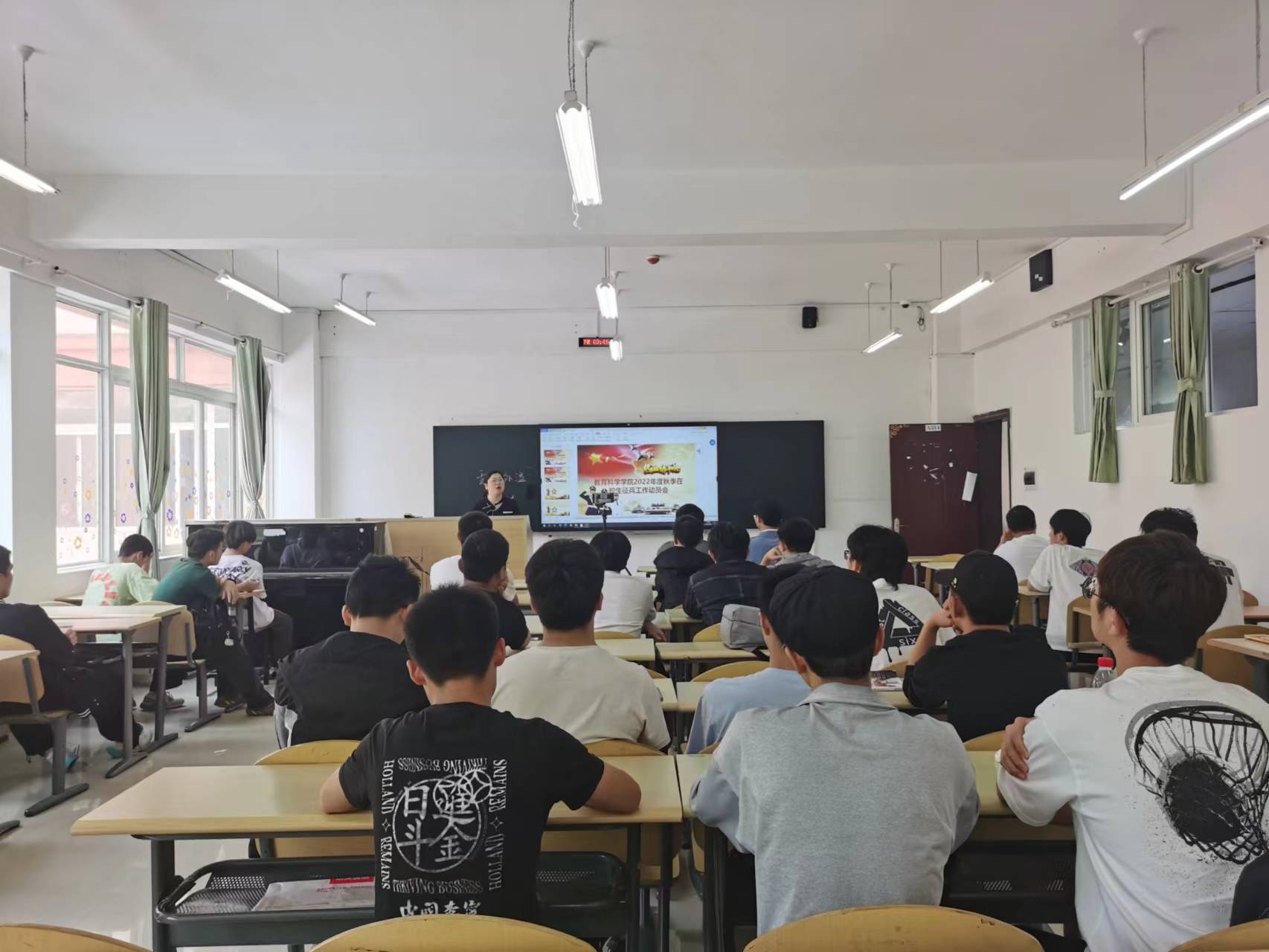4月28日,教育科学学院召开2022年度秋季在校生征兵工作动员会和2022年度秋季毕业生征兵动员会,会议在学院逸夫楼514教室举行。教育科学学院党委副书记傅小芳主持召开,教育科学学院适龄大一男生和毕业生分场次参加现场会议,适龄大二、大三男生线上参加此次会议。