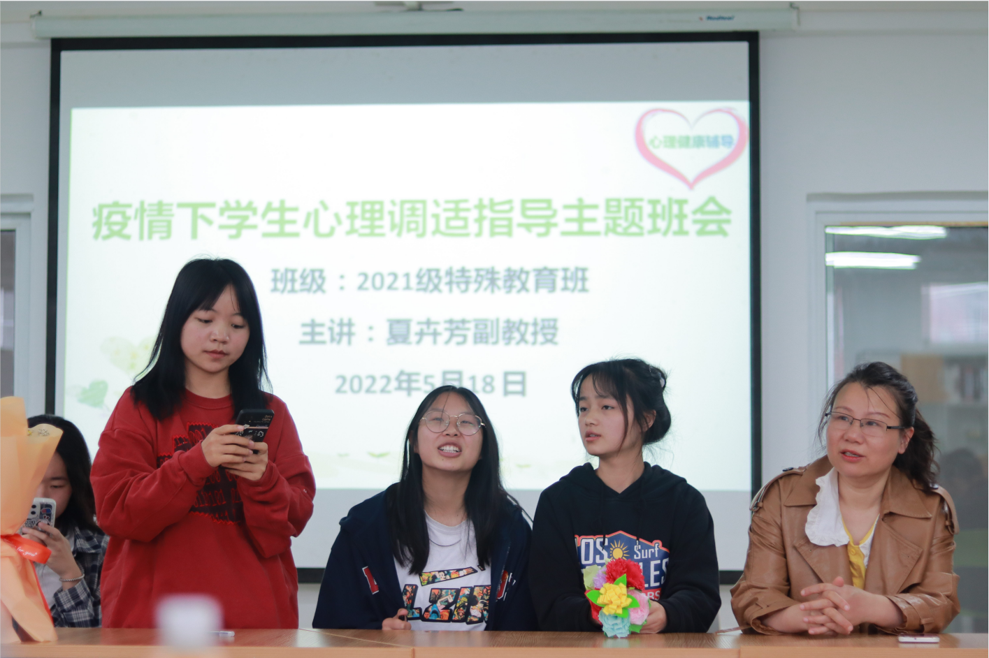 为了防止、减轻新型冠状病毒疫情导致学生的焦虑、烦躁等不良情绪,5月18日下午,教育科学学院2021级特殊教育班班主任夏卉芳副教授带领全班学生在学校兰园四楼活动室进行了一场“疫情下学生心理调适指导主题班会”活动。