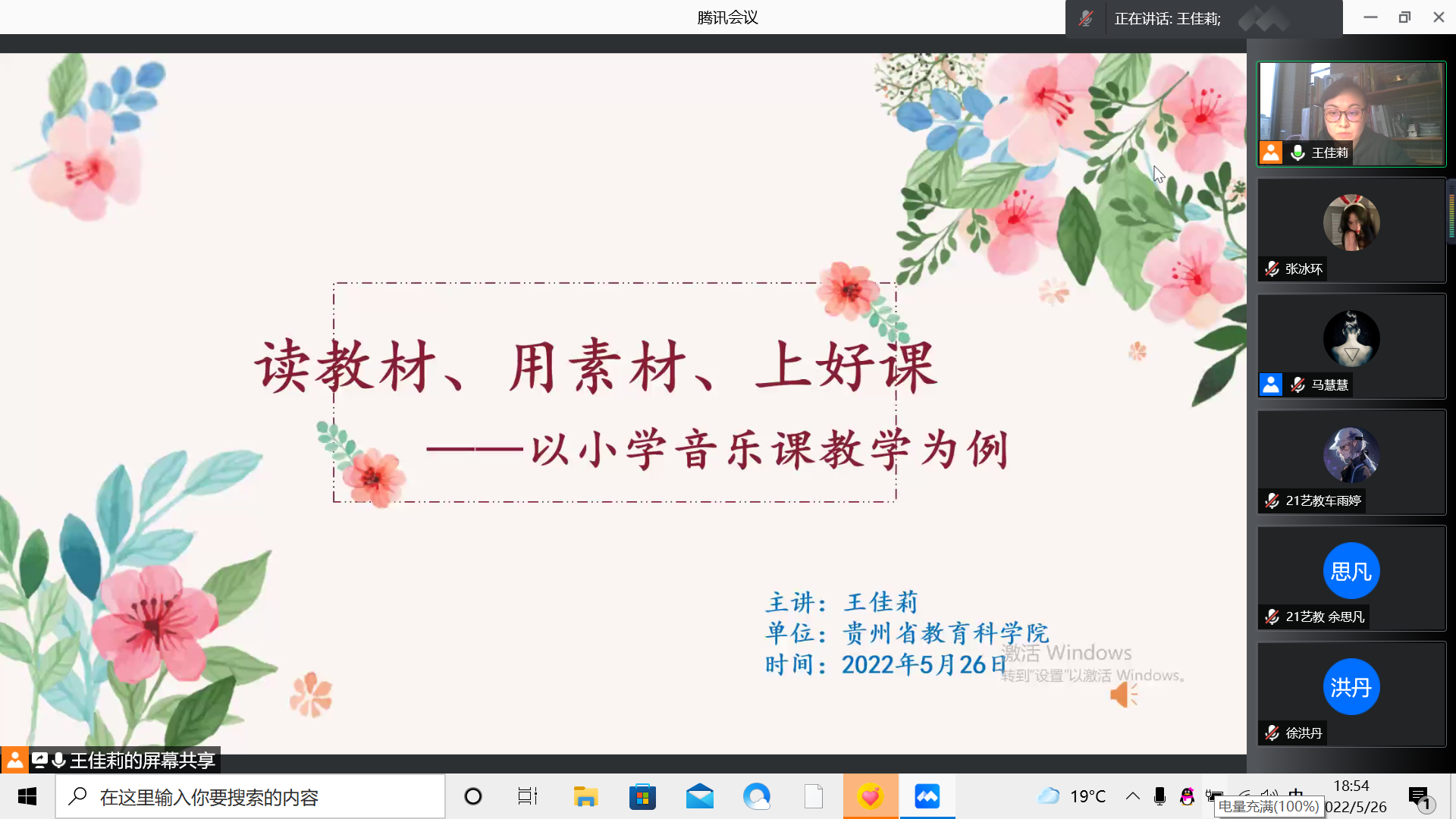 5月26日晚,艺术教育专业特邀贵州省教育科学院王佳莉老师,为艺术教育专业2019级音乐方向、2020级、2021级的同学们开展了《读教材、有教材、上好课》专题讲座,本次讲座因疫情原因,以腾讯会议的形式进行,艺术教育系系主任马慧慧主持了本次讲座。