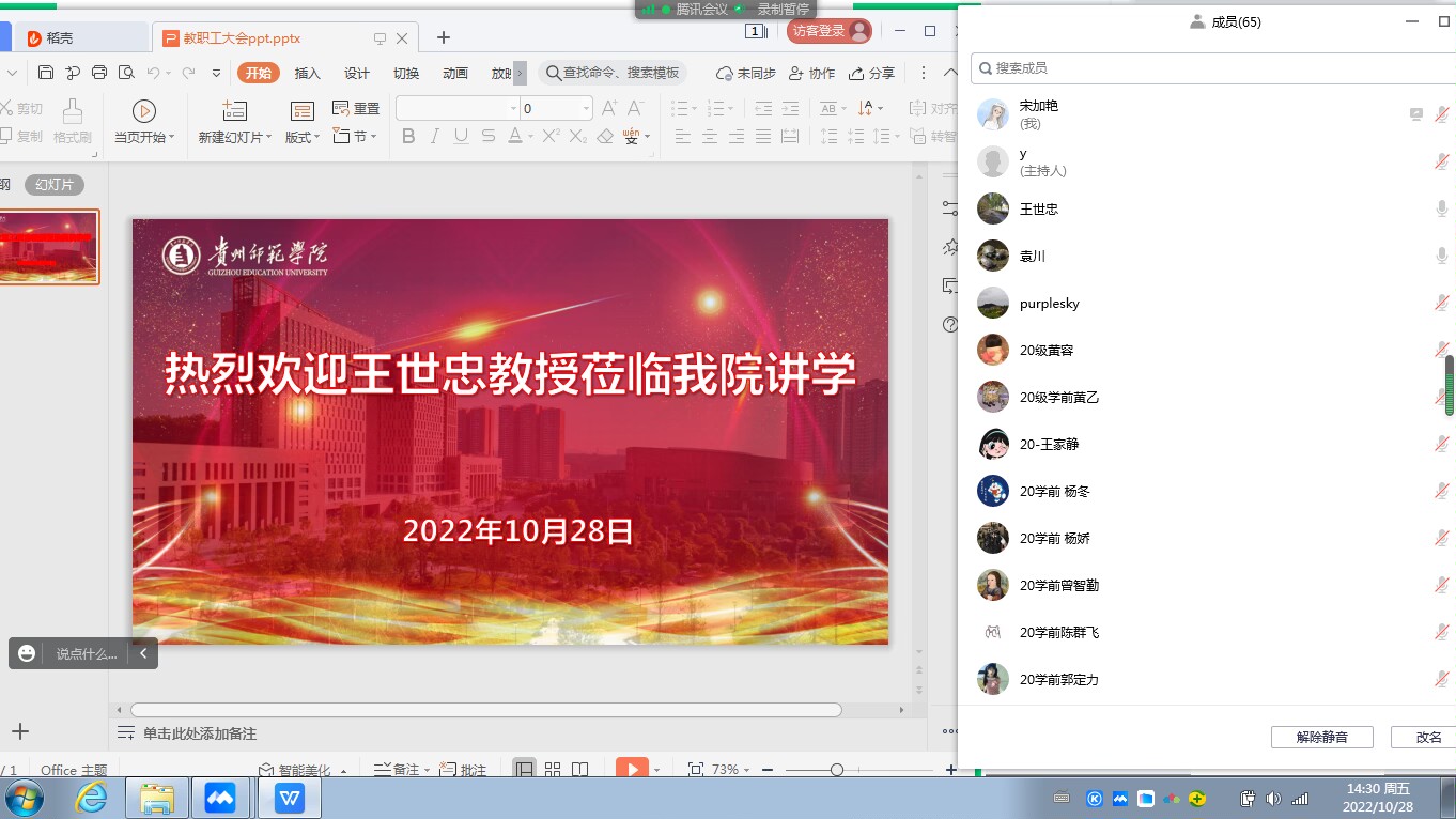 20221028日下午,教育科学学院和贵州教育发展研究中心邀请中南民族大学王世忠教授莅临我院讲学,讲座围绕党的二十大精神,以“增强教育服务中华民族伟大复兴的使命感”为主题,教育科学学院、教育发展研究中心全体教师以及部分学生参加。讲座由院长宋万琚主持。