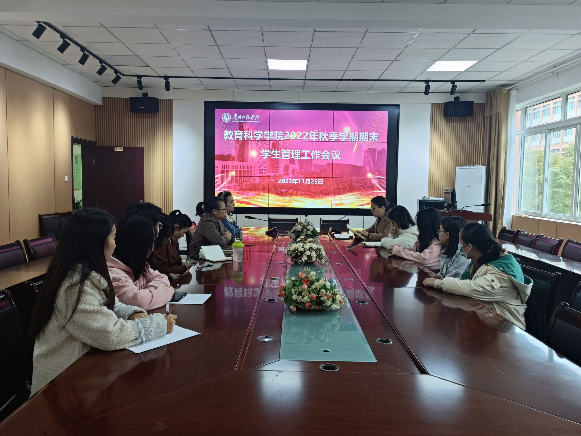 为做好学院学生期末疫情防控、安全教育和管理工作,2022年11月25日,教育科学学院在逸夫楼会议室召开2022年秋季学期期末学生管理工作会议,学院党委副书记傅小芳、学院团委书记张源、全体专兼职辅导员及科研助理参加了会议。此次会议采取线上线下方式进行,会议由傅小芳主持。