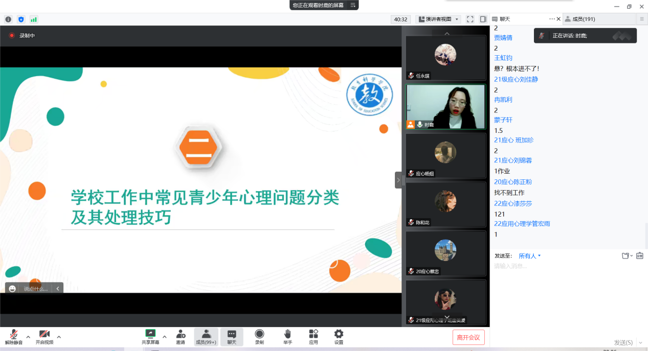 12月2日19时,教育科学学院应用心理学系和心理咨询站在腾讯会议开展了线上讲座。讲座主持人为教育科学学院应用心理学系主任倪磊,主讲人为赫章县义教和学前第四教育集团未成年人心理健康工作站站长、毕节市心理学会赫章工作组副组长、赫章县可乐中学特聘心理健康校外辅导员、国家三级心理咨询师许倩,参会人员为应用心理学系2020级、2021级、2022级全体学生及2019级部分学生。