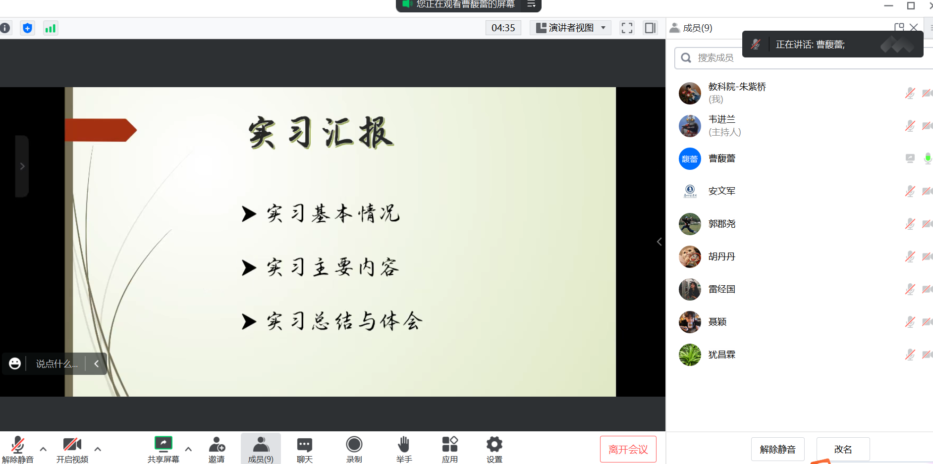 为进一步做好2023届优秀实习生评比工作,教育科学学院特殊教育专业优秀实习生实习汇报于2022年3月30日下午在腾讯会议上进行。会议由系实习领导小组组长朱紫桥主持,出席本次汇报会议的有雷经国、邓秀平、安文军等本专业老师。