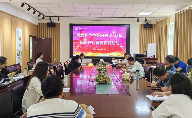 2023年4月21日,教育科学学院在学院会议室开展以“加强知识产权法治保障,有力支持全面创新”为主题的知识产权宣传教育活动。本次活动由院长宋万琚主持,副院长袁川领学,全院教职工参与了本次学习活动。