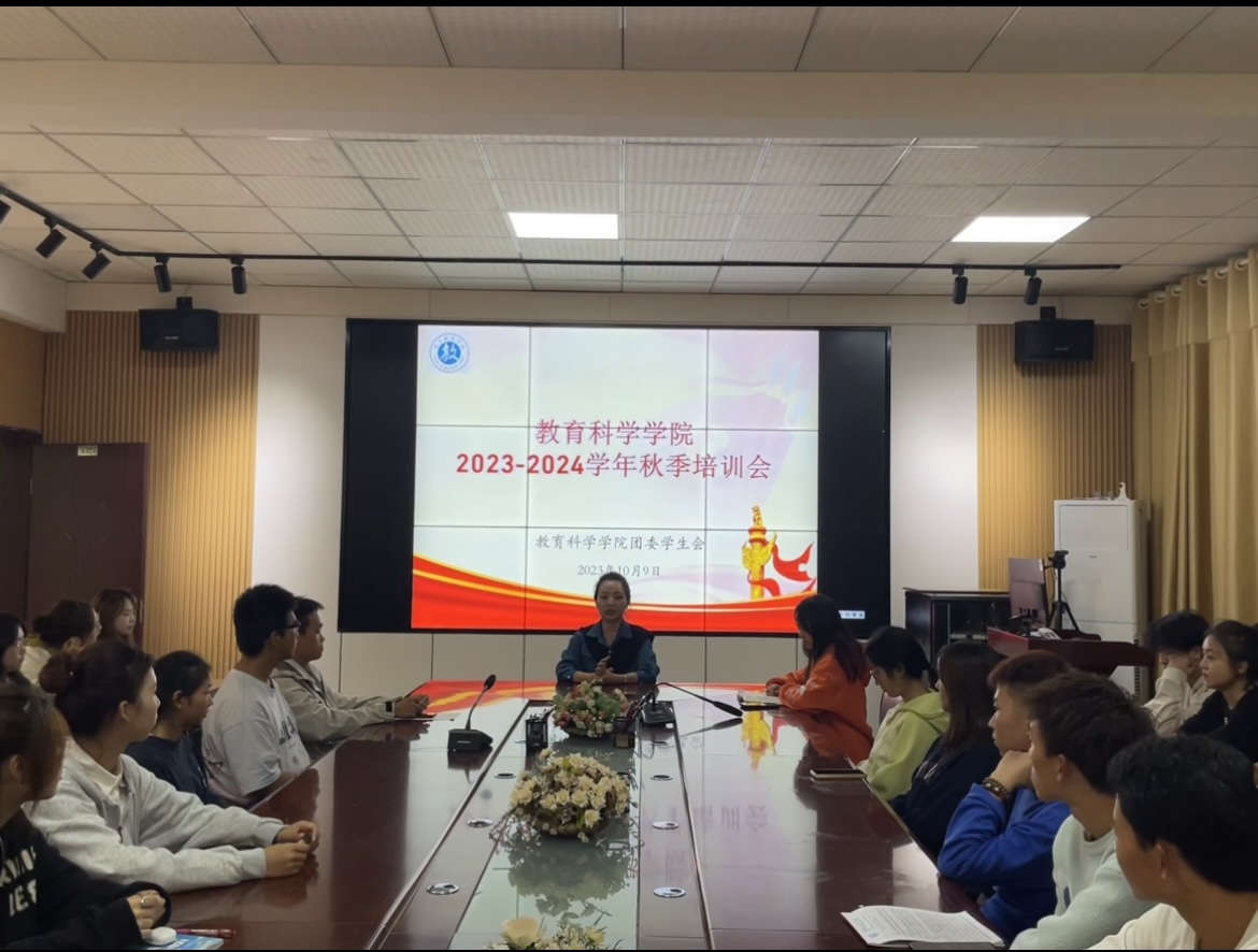 为进一步加强团委学生会学生干部队伍建设,提升学生干部自我管理、自我服务的水平。2023年10月9日,教育科学学院在逸夫楼321会议室开展团委学生会学生秋季培训会,本次会议由学院团委书记张源主持,团委学生会全体成员参加。