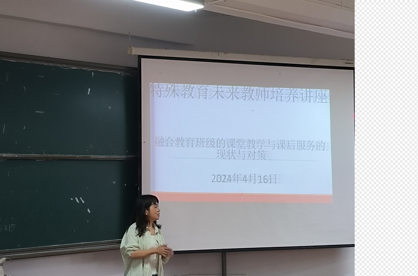 为提升本校特殊教育专业学生专业知能,拓宽专业视野,加强学生对融合教育的了解,为成为融合教育教师奠定基础。2024年4月16日下午,贵州师范学院特殊教育名师工作站和特殊教育系联合邀请了贵州省特殊教育省级名师、遵义市特殊教育学校王杨主任作了《融合教育班级的课堂教学与课后服务的现状与对策》的专题讲座。此次讲座由特殊教育名师工作站主任雷经国老师主持,特殊教育系邓秀平、杨曼等部分教师、特殊教育专业2021级、2022级的全体学生参与了讲座活动。