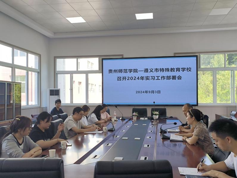 2024年9月3日,星期二上午,在遵义市特殊教育学校召开了“贵州师范学院-遵义市特殊教育学校2024年实习工作部署暨实习单位指导教师培训会”,为即将踏上实习岗位的学子们精心规划、全面布局,开启了实习生职场成长的精彩篇章。遵义市特殊教育学校承担2024年实习指导任务的所有教师、贵州师范学院赴遵义市特殊教育学校实习学生参加了会议。