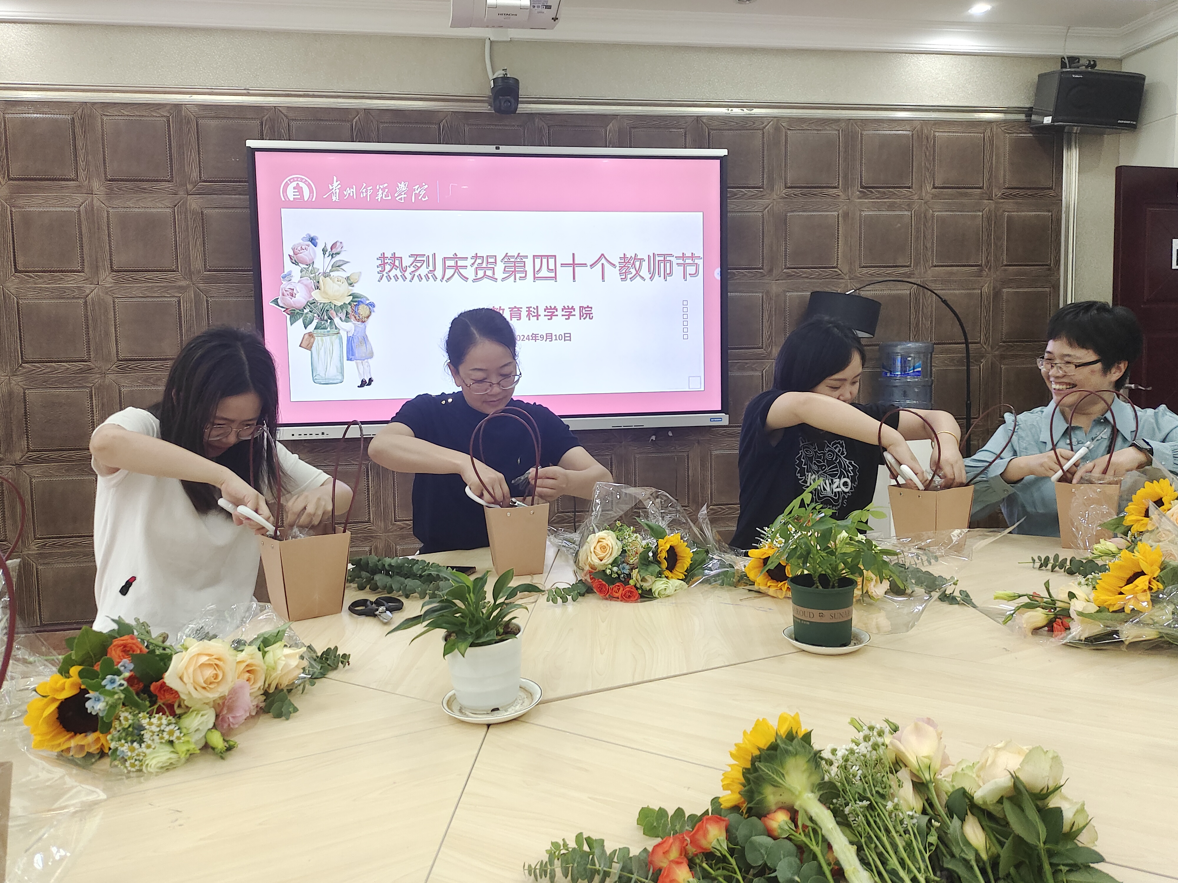 为了庆祝第40个教师节,2024年9月10日,由教育科学学院主办、学院工会承办的“为爱‘花’时间”插花活动在逸夫楼2楼活动室举行。院党委书记肖湘萍、副书记傅小芳出席活动,活动由院工会主席主懿芹主持。