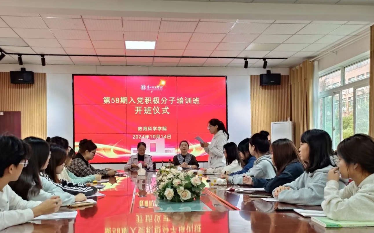 2024年10月14日,教育科学学院在学院321会议室开展第58期入党积极分子培训班开班典礼暨第一次专题党课。教育科学学院党委书记肖湘萍、团委书记张源以及全体入党积极分子参加了开班典礼,本次会议由张源主持。