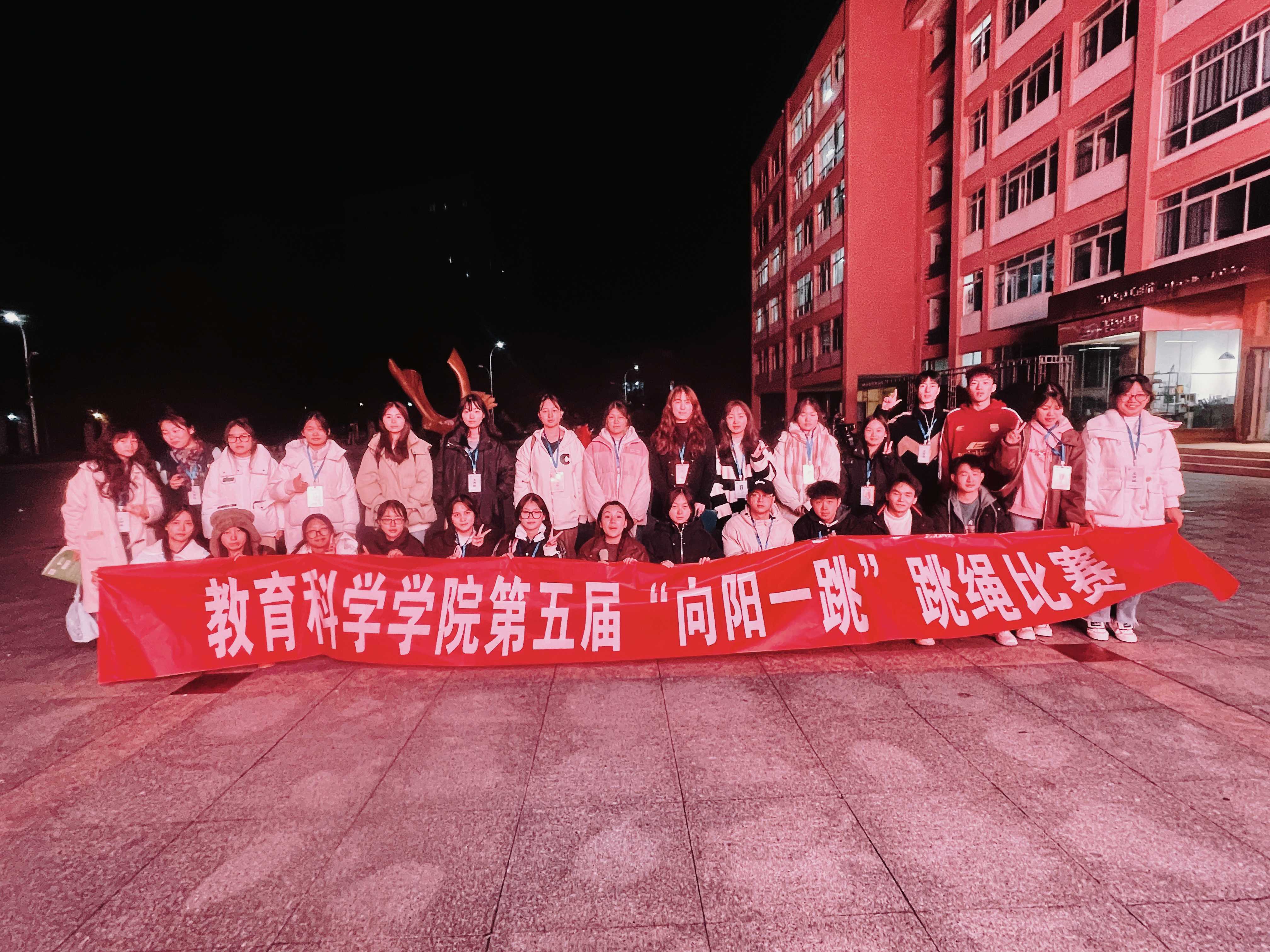 首先,由体育部副部长,23级特殊教育班王天祥为此次跳绳比赛致辞,接着24级应用心理学、学前教育二班新生代表杨烨、付婷婷宣布教育科学学院第五届“向阳一跳”跳绳比赛正式开始,随着裁判的一声哨响,摇绳的同学即刻开始双臂有力地挥动,跳绳的同学们排成整齐的队伍,呈“八字型”跳进与跳出。他们的动作协调一致,各班级代表队配合的也非常的默契,团体跳绳比赛将现场气氛推向了高潮。现场观众的加油助威声此起彼伏,而每一次成功的跳跃都凝聚着团队成员间的信任与协作。在这两分钟的比赛时间里,各班级代表队全力以赴,为了班级荣誉而拼搏。其中也不乏有小失误出现,但同学们相互鼓励,迅速调整状态,继续投入比赛,这种团结友爱的精神令人动容。最后,全体团委学生会成员及工作人员进行合影留恋。