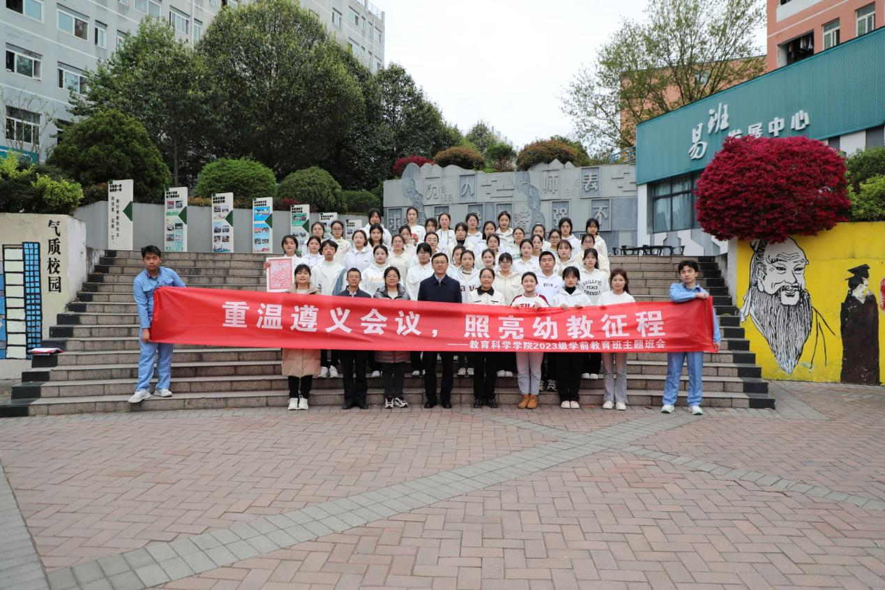 为纪念遵义会议召开90周年暨习近平总书记“运用好遵义会议历史经验,让遵义会议精神永放光芒”重要指示10周年,全面贯彻党的二十大、二十届三中全会精神,通过多形式、多维度活动深入贯彻遵义会议精神,将其与青年学子的思想教育紧密结合。2025年3月28日,教育科学学院在“一站式”学生社区服务中心召开以“重温遵义会议照亮幼教征程”为主题的“纪念遵义会议90周年”主题班会暨主题团日活动。校党委委员、副校长潘运作为此次班会的主讲人,带领大家探寻红色精神与教育使命的深刻联结。学生工作部部长何毅、副部长杨兴萍、副部长官鹏飞、教育科学学院党委书记肖湘萍、院长宋万琚、副书记傅小芳、辅导员鲁蓓蓓、2023级学前教育专业全体同学参加了本次班会暨主题团日活动。