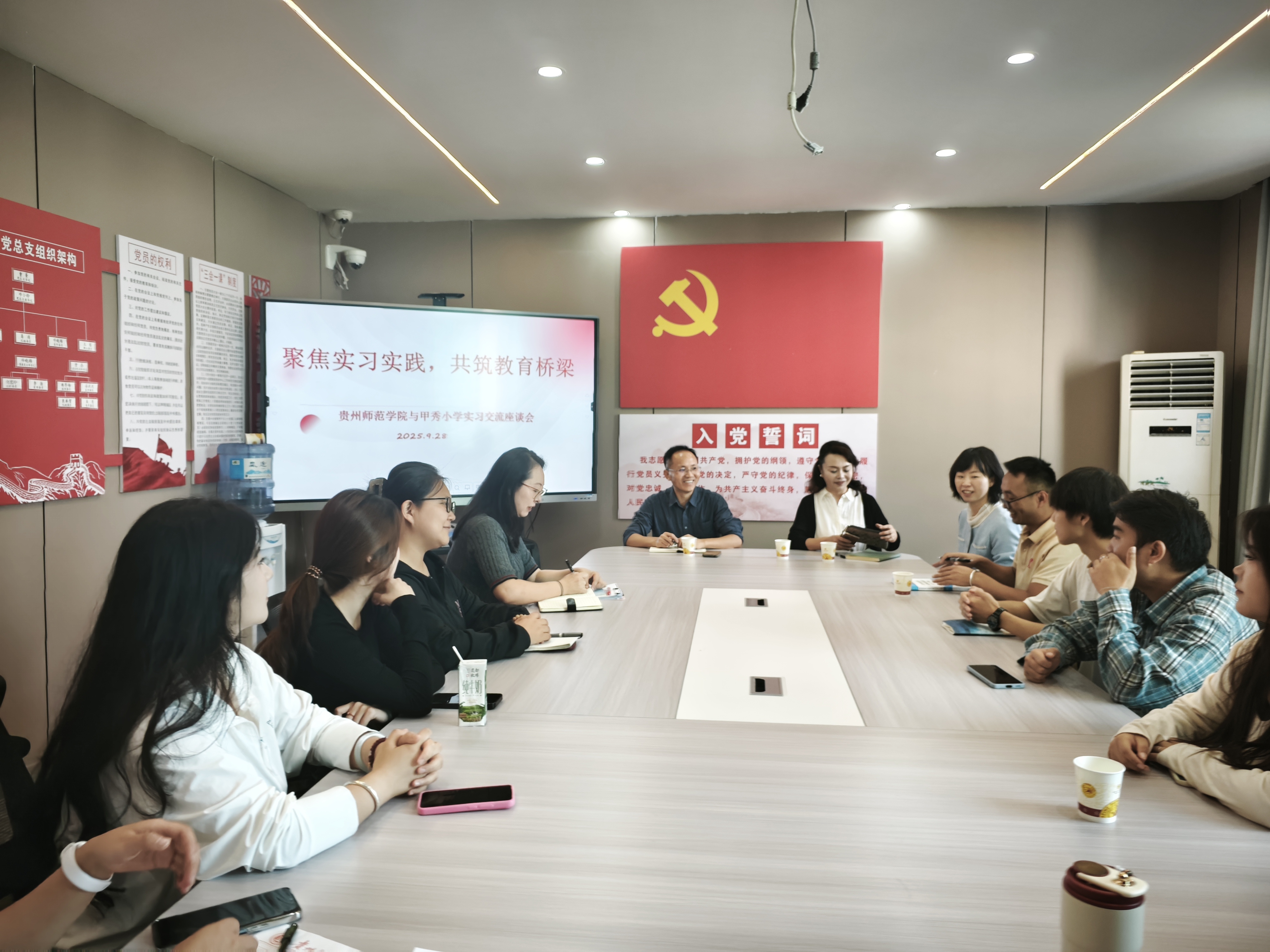 9月27日,教育科学学院黎平辉副院长、督导组莫太极老师及实习点负责人申利丽老师同甲秀小学邓小玲校长、黄艳主任与实习负责人王丹老师,共同召开2025届艺术教育专业实习生座谈会。